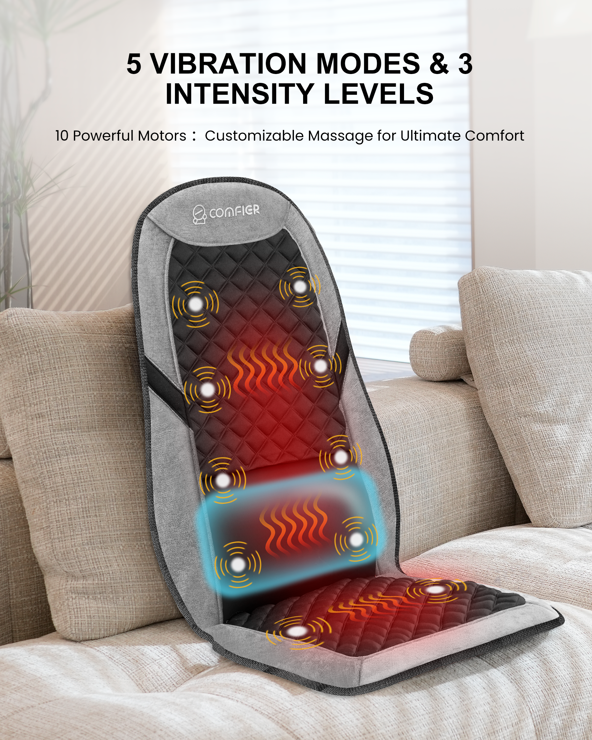 COMFIER chair back massager with heat provides comforting warmth in both the back and seat areas, with two adjustable heat settings and NTC smart temperature control to maintain steady, cozy heat. With built-in 30/60/90-minute auto shut-off timers, this heated massage pad ensures safe. Perfect for chilly seasons, it makes a warm and practical gift for loved ones, especially seniors who need gentle daily comfort.