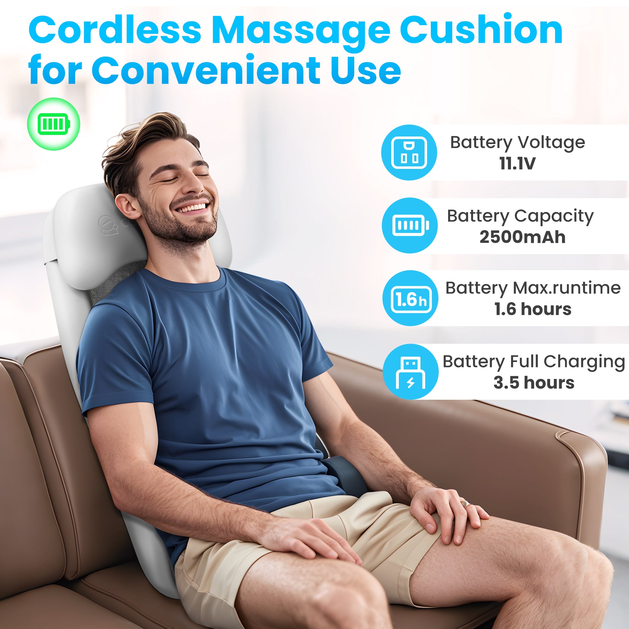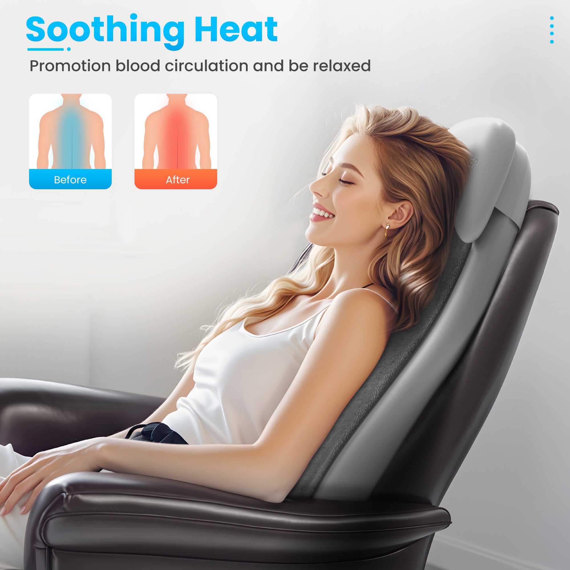 Comfier back massager with heat combines shiatsu, spot, rolling, and vibration massage and heat functions for a comprehensive relaxation experience. Shiatsu & rolling kneads the back, while the seat offers vibration massage. Also, there is are built-in heating function for the back, which can greatly promote blood circulation and relax muscles. Besides, there are 15/20 mins auto timer available for overheat protection.