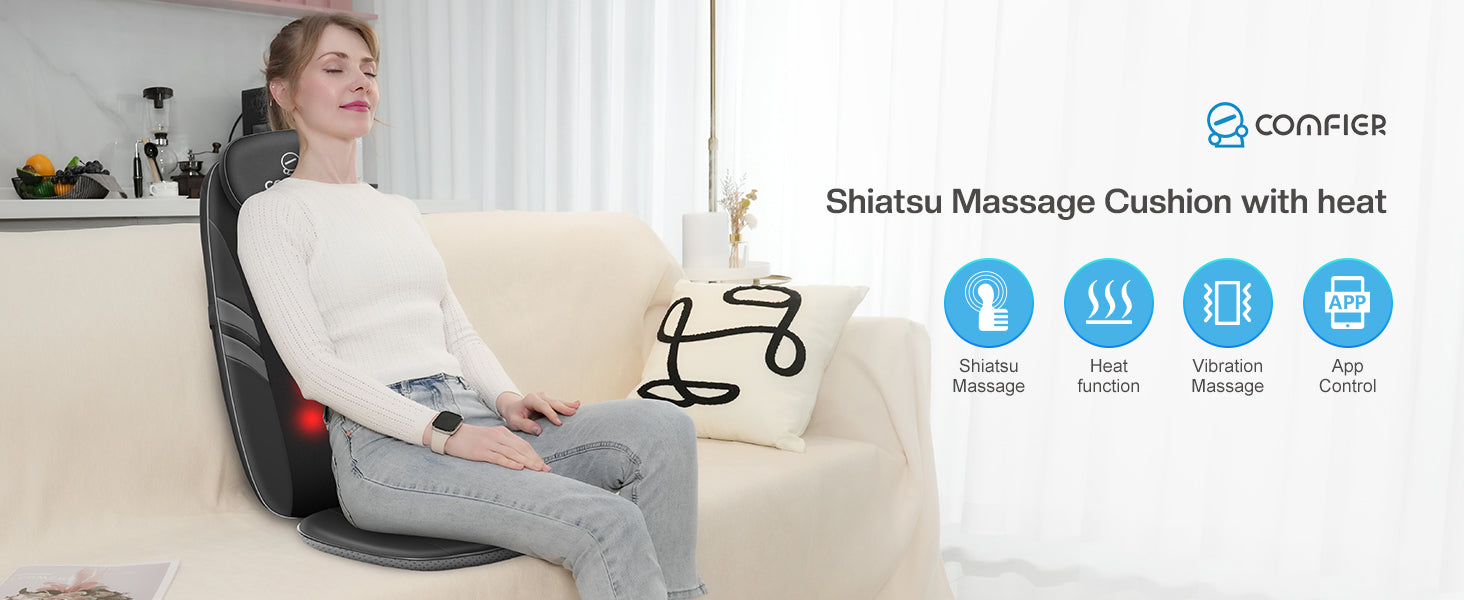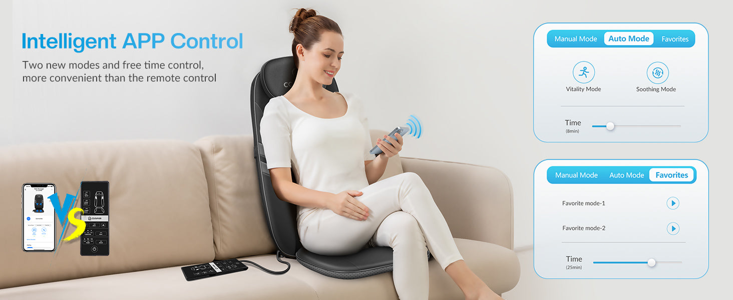 Instead of constantly searching for the control panel, you can use your smartmobile phone to operate the chair back massager through the "Comfier" app. The feature not only offers ease of use but also comes with a timer of 15 minutes, allowing you to set any desired massage time. In addition, you need not worry about the control panel malfunctioning and rendering the back massager unusable.