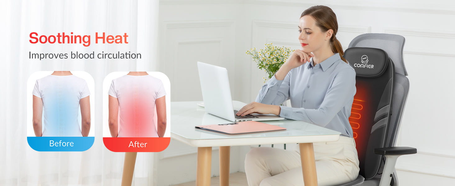 Comfier lower back massager features 3 levels of intensity, which can be adjusted according to your preference. Our back massager for back pain deep tissue delivers a comfortable experience to the hips and thighs, helping to relieve tension in these areas. Please note that this feature only provides vibration massage and does not include heat therapy in the sitting area.