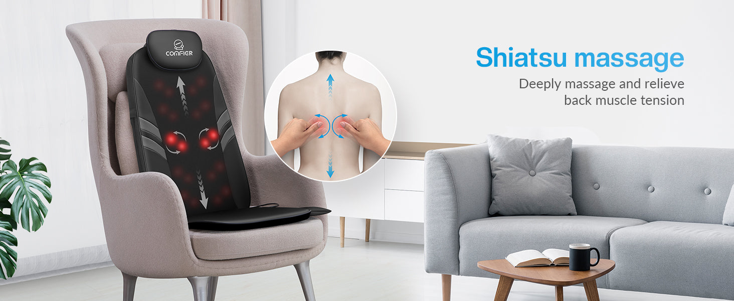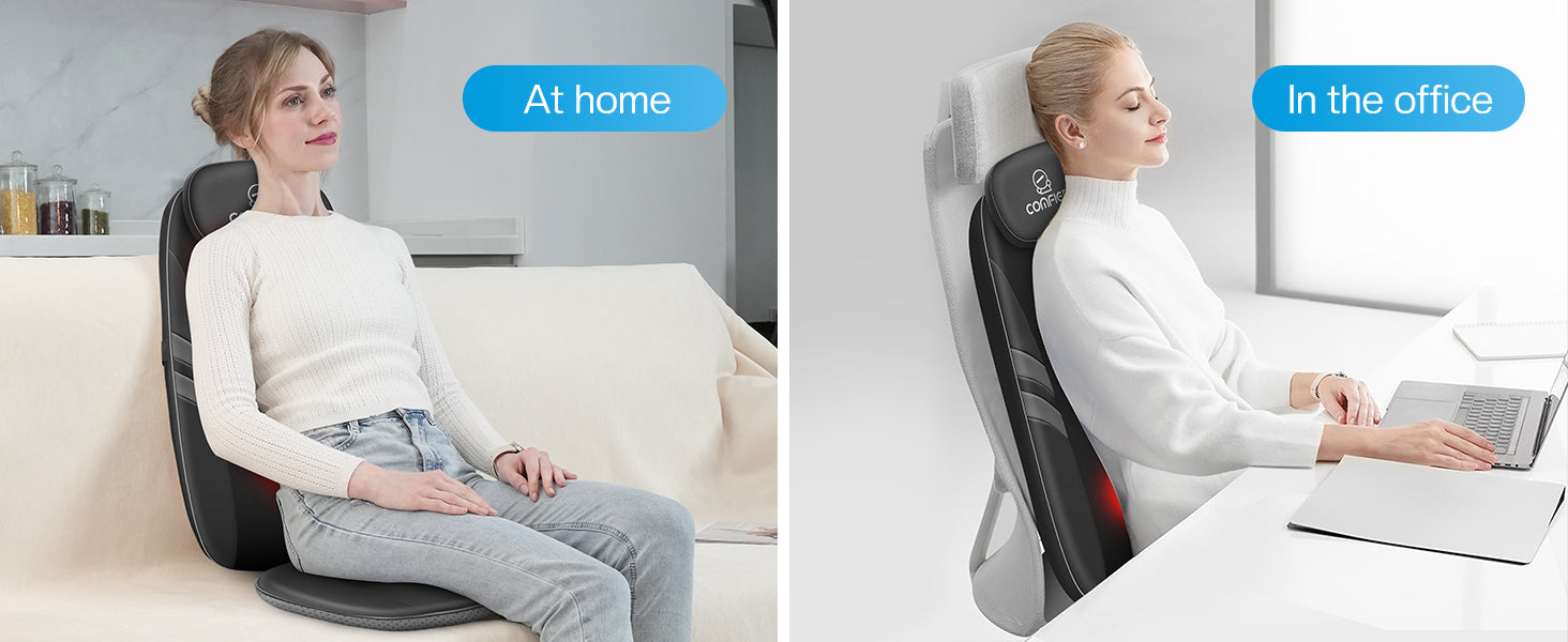 Comfier back massager with heat offers a calming heat therapy option that can effectively alleviate stiffness and fatigue in the back and lumbar areas. This added warmth can also promote the relaxation of the muscles. Meanwhile, the massage pads for chairs feature shiatsu rollers and 4 massage nodes, enabling deep tissue kneading massage for the entire back area.