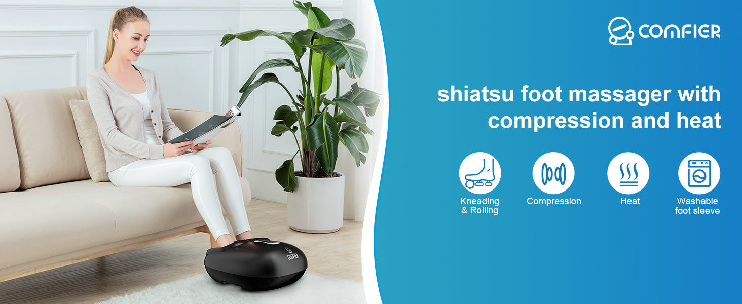 Comfier foot massager with heat features, shiatsu rollers that provide a deep-kneading massage, imitating the techniques and movements of a professional masseur. This massage technique delivers efficient pressure on the soles, which can greatly alleviate foot soreness and muscle tension after a tiring working day.