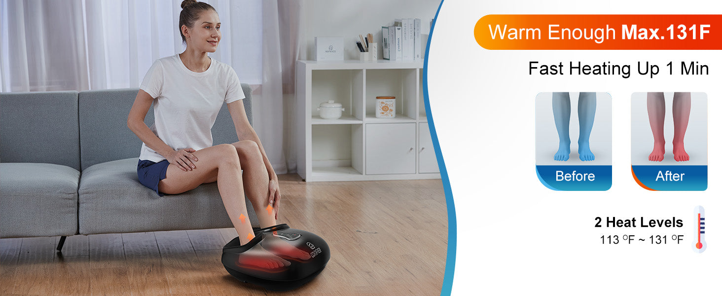 The Comfier foot massager heats up quickly in seconds and can reach temperatures up to 131Β°F, making it an excellent foot heater and foot warmer for women and men who want to warm up their cold feet during winter. This feature also helps improve blood circulation, reduce body fatigue, and promote better sleep. The machine includes high/low heat settings, and the heating function can work independently.