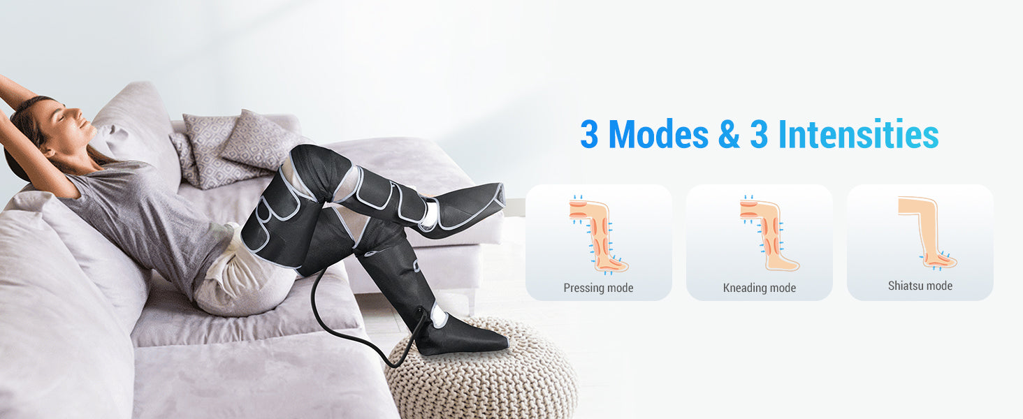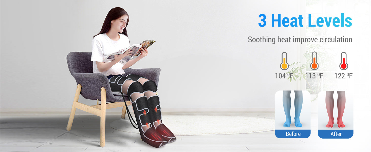 Comfier leg compression machine comes with 3 intensities and 3 heating levels (low-middle- high) to improve circulation by intermittently squeezing the leg veins, then releasing the pressure, loosening up tight muscles, breaking up stubborn knots, and relieving symptoms of arthritis.