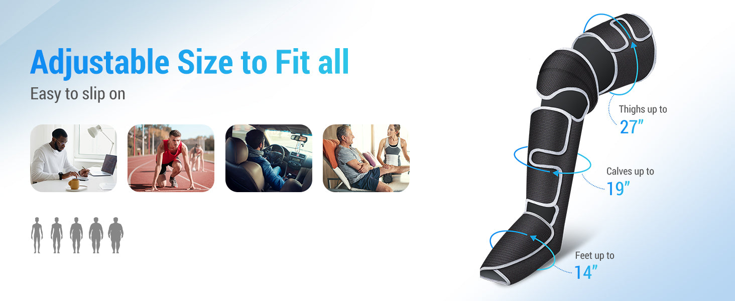 Comfier massager for legs with adjustable velcro strap can be up to 13 inches in thigh diameter to fit elderly, young women, men, dads, moms, white, and black of different shapes and sizes. Comfier compression leg wraps are made of high-quality breathable fabric and are durable for long-term use.