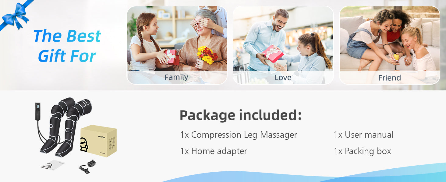 Comfier Air Compression Wrap Machine can help the body release substances that prevent blood clots. It is an ideal gift for her, him, mom, dad, friend, the elderly, etc, your loved one to get daily relaxation wherever he/she is in the office or at home, on the bed or sofa, or on a trip. A perfect gift choice for birthdays, Motherβs Day, Fatherβs Day, Thanksgiving, and Christmas. It comes with 30 days of free returns and a 1-year warranty.